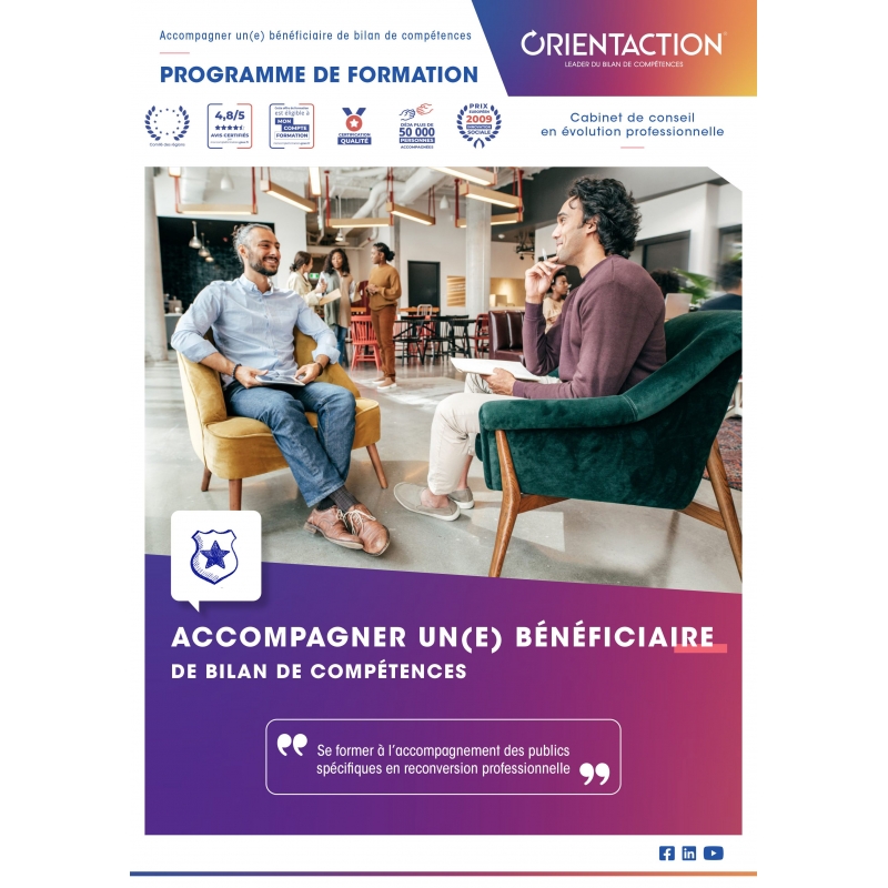 Cette formation est le premier module du parcours de formation pour l’obtention de la certification « Accompagner un(e) bénéficiaire d’un bilan de compétences » inscrite au répertoire spécifique par France compétences (RS5506). La réalisation de cette formation donne accès à tous les outils et supports méthodologiques utilisés par ORIENTACTION dans le cadre d’un accompagnement en bilan de compétences. Les outils sont utilisables librement dans le cadre d’une activité commerciale à condition d’appartenir au groupe ORIENTACTION (contrat de sous-traitance ou contrat de licence de marque et de partenariat commercial).