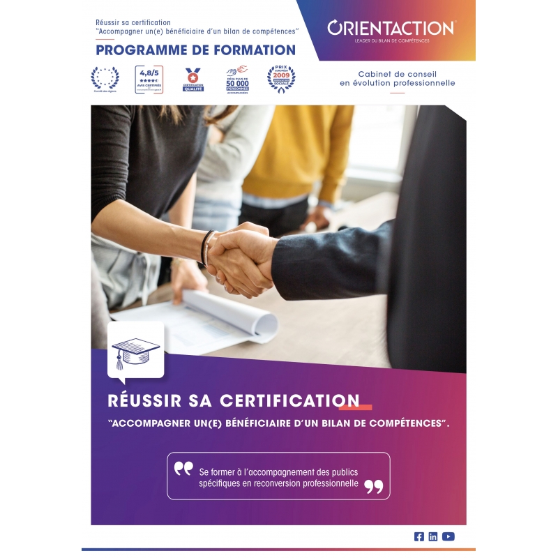 Cette formation est le premier module du parcours de formation pour l’obtention de la certification « Accompagner un(e) bénéficiaire d’un bilan de compétences » inscrite au répertoire spécifique par France compétences (RS5506). La réalisation de cette formation donne accès à tous les outils et supports méthodologiques utilisés par ORIENTACTION dans le cadre d’un accompagnement en bilan de compétences. Les outils sont utilisables librement dans le cadre d’une activité commerciale à condition d’appartenir au groupe ORIENTACTION (contrat de sous-traitance ou contrat de licence de marque et de partenariat commercial).
