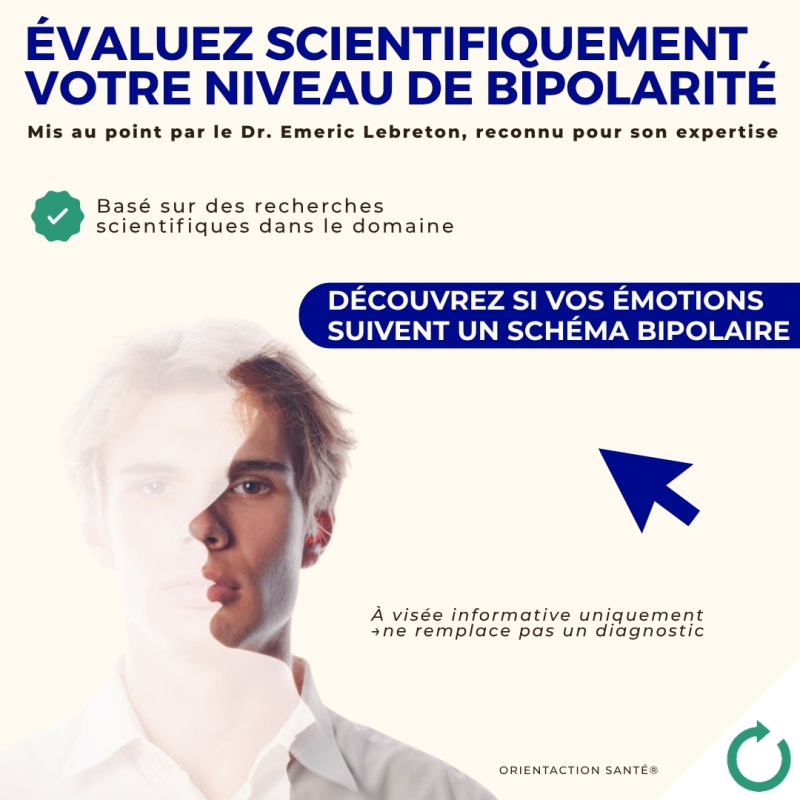 Basé sur le Mood Disorder Questionnaire (MDQ) développé par Hirschfeld et al. (2000), ce test a été conçu par Emeric Lebreton, docteur en psychologie, et fondateur d’E-ORIENTACTION. Il vous permet d’explorer de manière fiable et bienveillante certaines fluctuations émotionnelles et comportementales caractéristiques des troubles bipolaires.