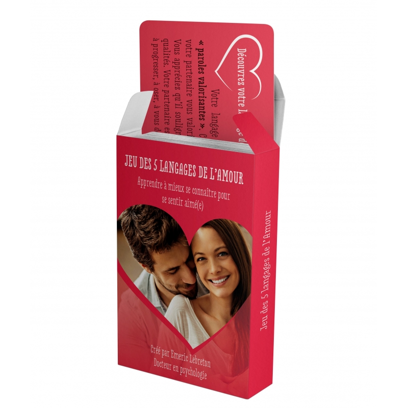 Le jeu des 5 langages de l'Amour est un jeu destiné à tous les couples qui souhaitent mieux se connaître et mieux communiquer. Chacun d'entre nous possède ses propres langages de l'Amour qui font qu'il se sentira aimé(e). Apprendre à parler le langage de son partenaire est une étape essentielle pour mieux le comprendre et développer une relation harmonieuse. Le jeu des 5 langages de l'Amour est un jeu de connaissance de soi pour améliorer sa vie de couple.