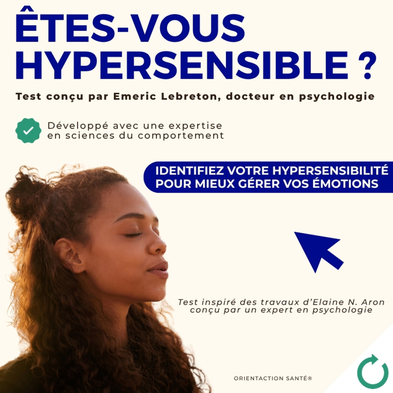 Basé sur les travaux de Elaine Aron (1996), pionnière dans l’étude de l’hypersensibilité, ce test a été conçu et actualisé par Emeric Lebreton, docteur en psychologie, pour E-ORIENTACTION. Grâce à 15 questions simples, ce test vous permet d’identifier si vous êtes hypersensible et de mieux comprendre vos réactions émotionnelles, sensorielles et relationnelles.