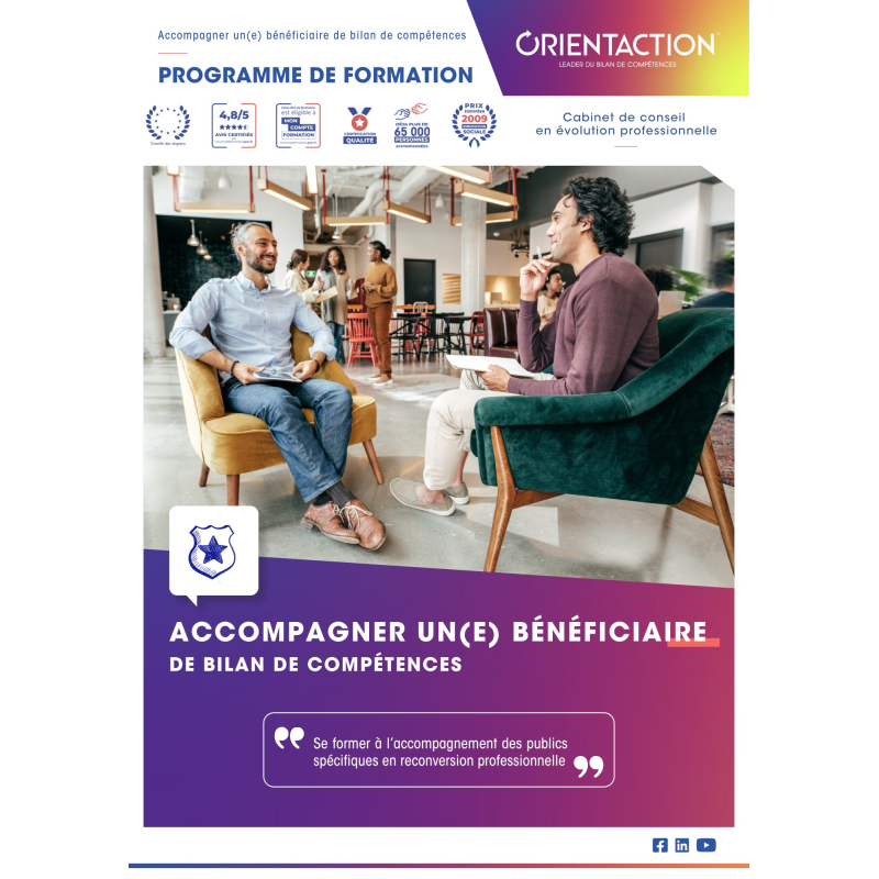 Cette formation est le premier module du parcours de formation pour l’obtention de la certification « Accompagner un(e) bénéficiaire d’un bilan de compétences » inscrite au répertoire spécifique par France compétences (RS6340). La réalisation de cette formation donne accès à tous les outils et supports méthodologiques utilisés par ORIENTACTION dans le cadre d’un accompagnement en bilan de compétences. Les outils sont utilisables librement dans le cadre d’une activité commerciale à condition d’appartenir au groupe ORIENTACTION (contrat de sous-traitance ou contrat de licence de marque et de partenariat commercial).