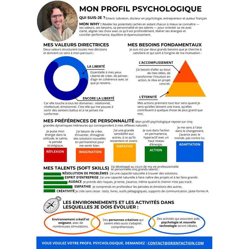 Cette évaluation a été conçue par Emeric Lebreton, docteur en psychologie, auteur de près de 40 ouvrages et fondateur du groupe ORIENTACTION. Il est reconnu pour son expertise dans les domaines du développement personnel et de l’orientation.